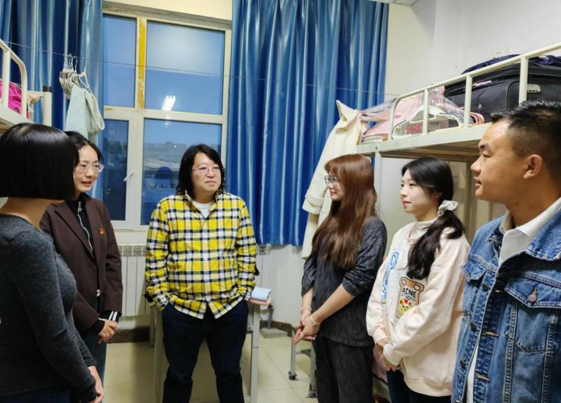 班主任来到新生宿舍查看宿舍设施配置情况,排查安全隐患。
