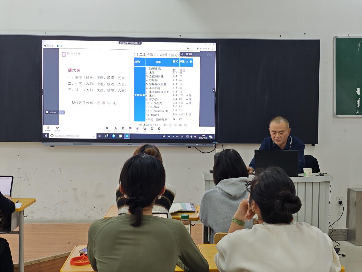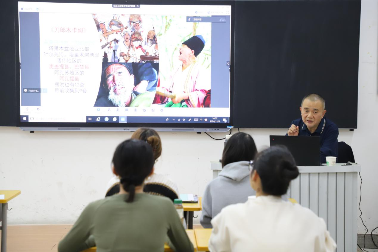 2024年11月6号,为传承和弘扬中华民族优秀传统文化,文化艺术学院举办“十二木卡姆的音乐形态”学术讲座。中央音乐学院博士生导师、新疆艺术学院音乐学院名誉院长、天池学者肖学俊教授受邀担任主讲,文化艺术学院2024级全体研究生参与。
