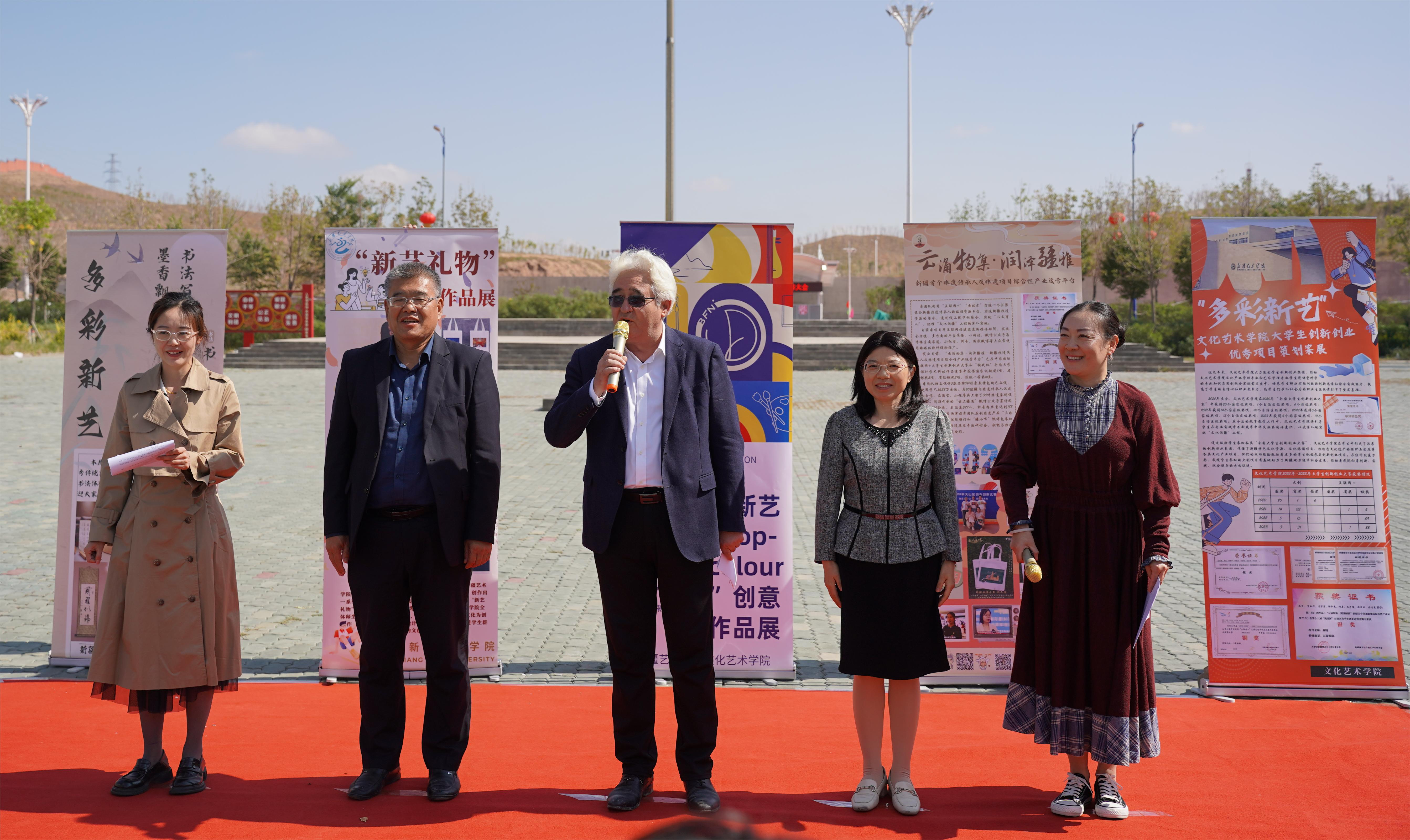 9月22日,文化艺术学院“多彩新艺”校园文创作品展在新疆艺术学院金桥校区顺利开幕。学校党委副书记、院长莫合德尔·亚森出席并宣布开幕,党委副书记、副院长钱玲,党委常委、副院长全立新出席开幕式,文化艺术学院党委领导班子、相关单位负责人和专业师生200余人参加了开幕式。