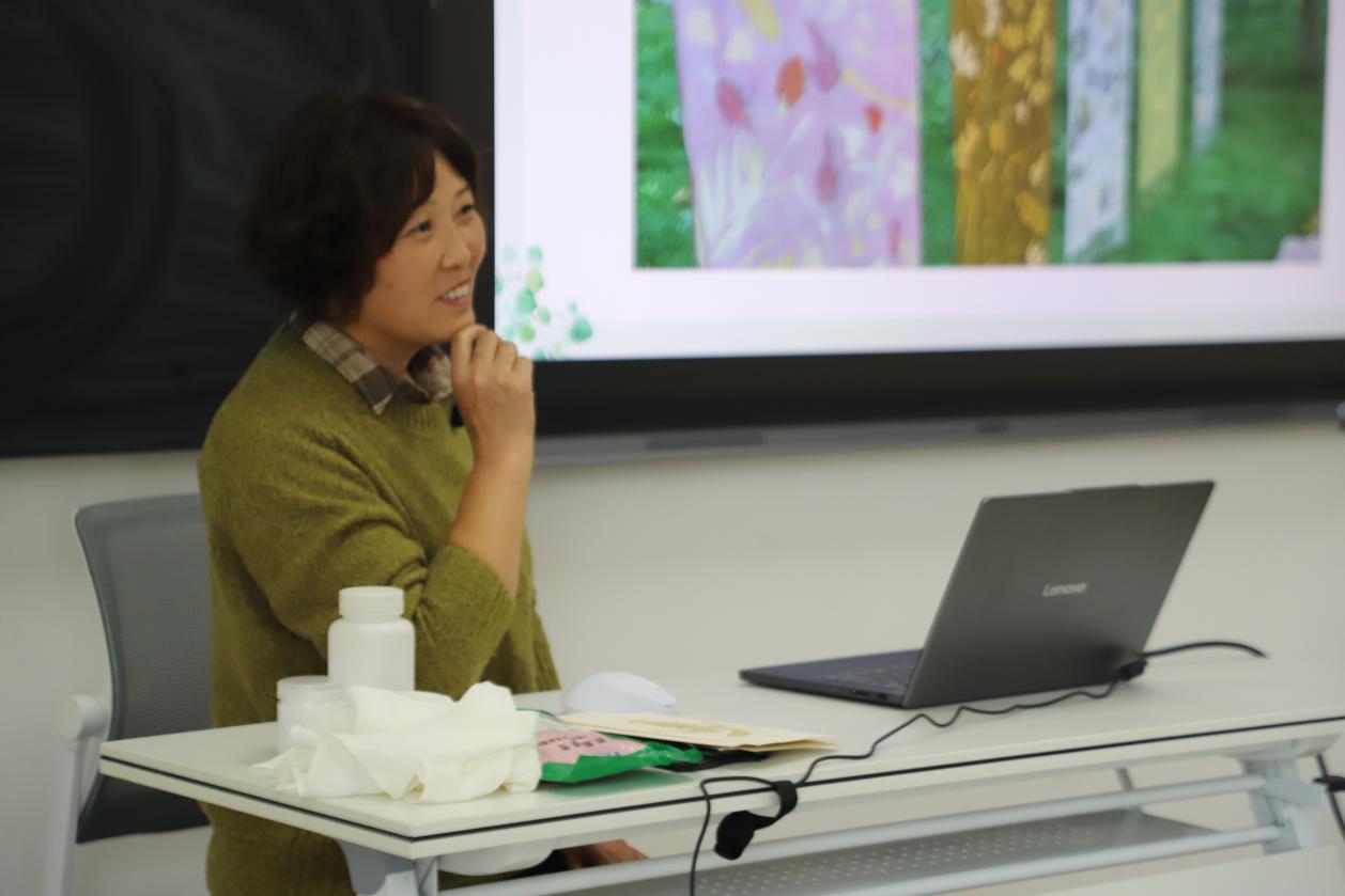 翟慧卿老师先从介绍植物染、扎染开始。结合自身研究与实践经验,讲解植物染相关知识、扎染技艺要点等内容,让师生深入了解这两项传统工艺的文化价值与实践方法。